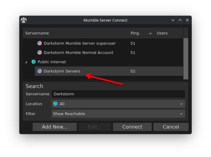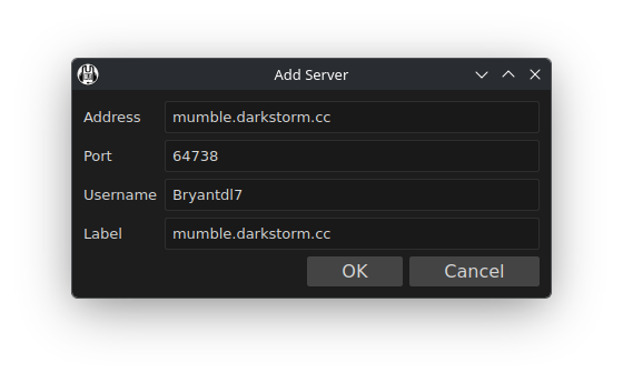 Click add new server, and fill in the hostname as mumble.darkstorm.cc: